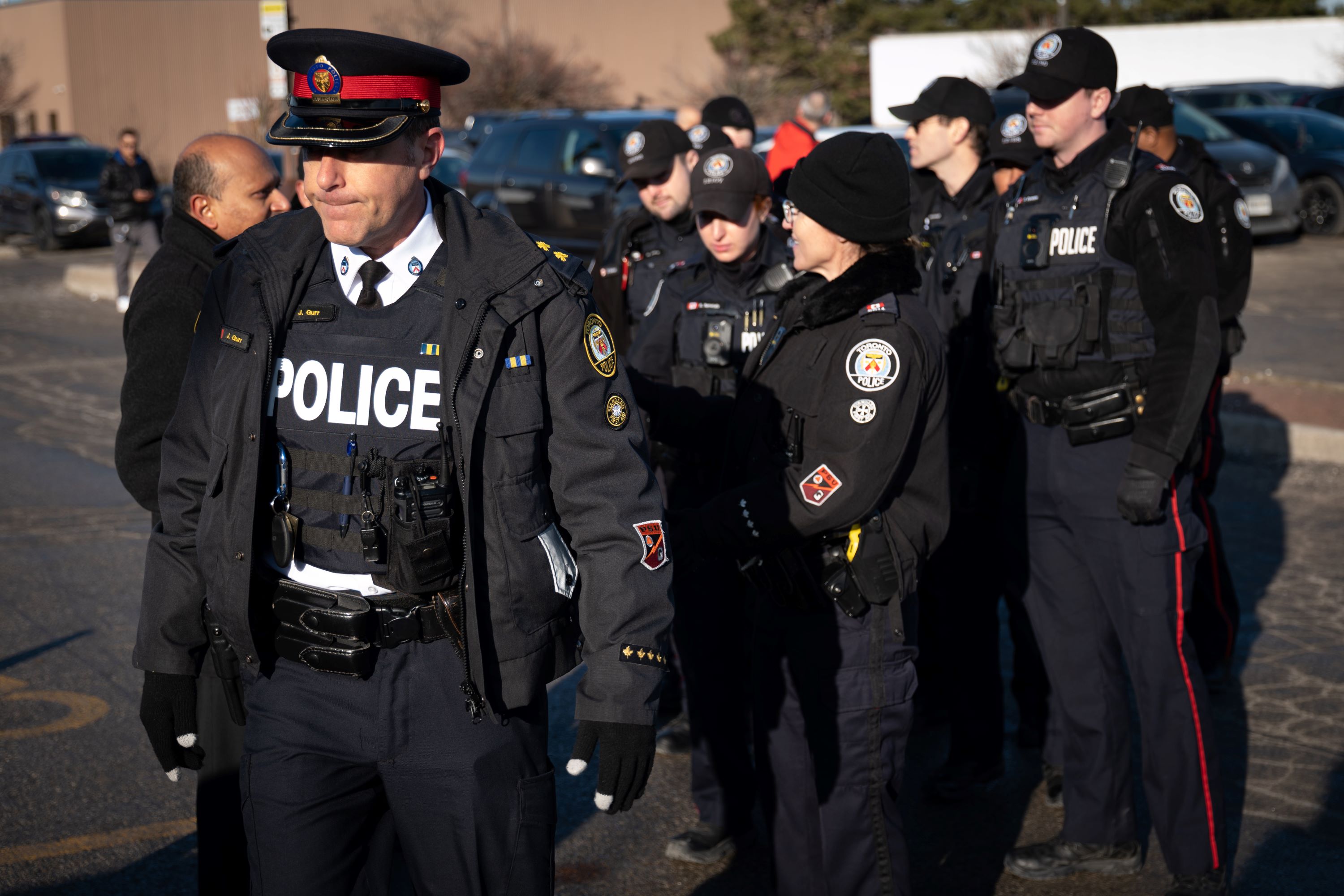 Police prepared to arrest demonstrators as they blocked entrances to TTM Technologies in Scarborough, Feb. 26, 2023. The protesters targeted TTM for producing and exporting military circuit boards to Israel for fighter jets and targeted bomb systems. Photo by Ian WillmsDemonstrators obliged, chanting “TPS-KKK-IDF-YOU’RE ALL THE SAME!” as they moved onto the sidewalk to continue their demonstration as the cops looked on.