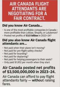 Firstly, it is probable that this comes from the union representing Air Canada flight attendants–the Canadian Union of Public Employees (CUPE). I have already shown that this union–the largest Canadian union–uses the cliche of “fair contracts” often enough (without ever justifying the cliche) (Fair Contracts (or Fair Collective Agreements): The Ideological Rhetoric of Canadian Unions, Part One: The Canadian Union of Public Employees (CUPE). Such a cliche serves to hide the fact that no contract (including collective agreements) can express something fair since the employment relation involves treating human beings as things to be used for purposes undefined by those human beings–as mere means to other persons’ ends (and, in the context of Air Canada, as a means for obtaining more money–see the money circuit link mentioned at the beginning of this post).